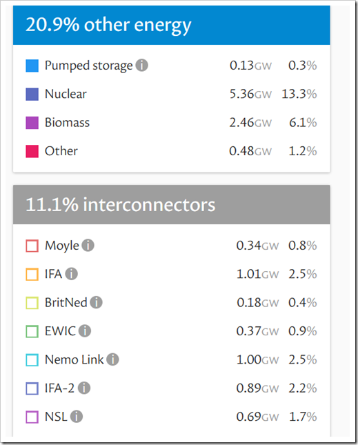 Bear in mind that generation connected at the distribution level voltages is not included. That includes a lot of small scale wind and solar, and diesel and gas backup generation, much of it “behind the meter” at industrial sites seeking to reduce triad risk – being caught using power on one of the three peak demand half hours over the winter, for which a very large capacity payment is extracted. Lately, those subject to wholesale related pricing have found they can generate more cheaply for themselves from diesel during more of the day.