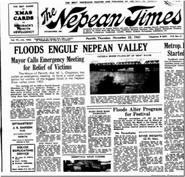 New South Wales suffered some of the worst floods in its history in November 1961, probably only surpassed by the ones in 1900. The Nepean Times reported: