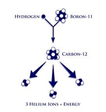 One Boron-11 plus a proton creates Carbon-12 and 3 Helium-2 atoms?