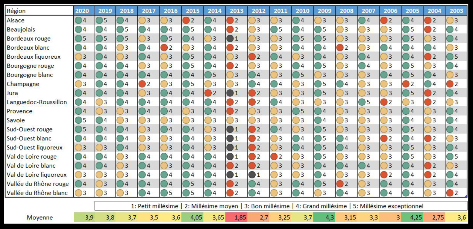 This chart shows a categorisation of vintage (millésimes) in different wine growing regions in France by year. 1=poor to 5=exceptional.
