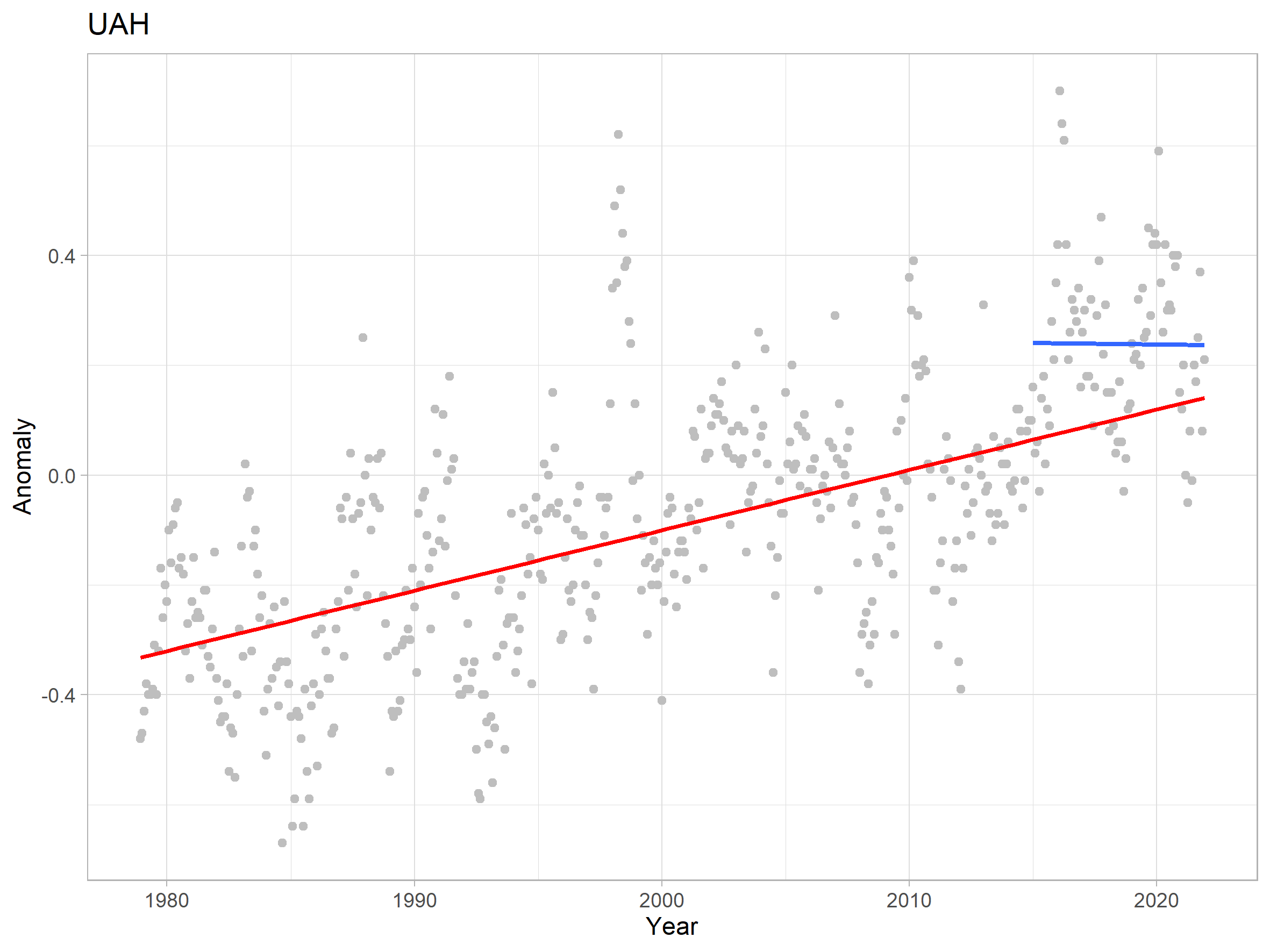 My point is that the recent high temperatures, even though they don’t show a warming trend in themselves, reinforce the long term warming in the UAH data set. Therefore they in no way indicate that long term warming has stopped. If anything, they suggest the opposite.
