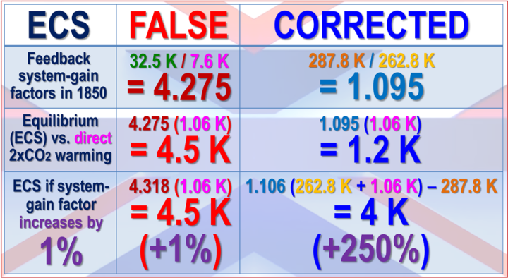 For 1850, climatologists (e.g. Lacis et al. 2010, an influential paper explicitly embodying the error) neglect the emission temperature in deriving the system-gain factor, which they take as the ratio of the 32.5 K natural greenhouse effect to the 7.6 K direct warming by all naturally-occurring greenhouse gases up to 1850. Thus, 32.5 K / 7.6 K gives the implicit system-gain factor 4.3 (given in Lacis as ~4). Multiplying the 1.05 K direct doubled-CO2 warming by 4.3, one would obtain 4.5 K final doubled-CO2 warming, also known as equilibrium doubled-CO2 sensitivity (ECS).