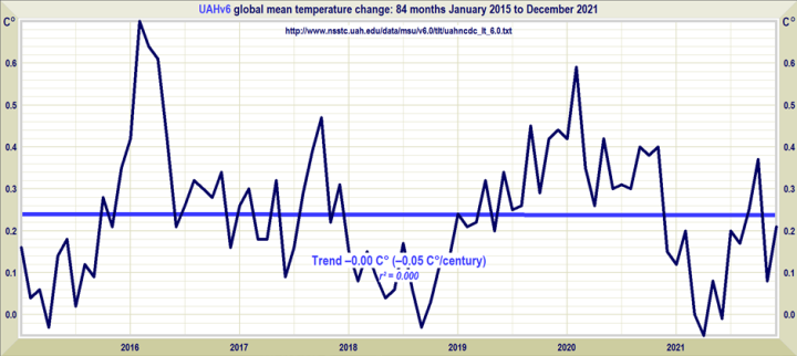 To put numbers on it, there are 434 consecutive overlapping 84-month periods in the latest UAH_TLT data set. Of these, fully 116 either show zero warming or else a cooling trend. The warming trend in UAH up to the start of this latest 84-month pause, Dec 1978-Dec 2014, was +0.11C per decade. Including this latest 84-month pause (Dec 1978 – Dec 2021) increases the this warming rate to +0.14C per decade.