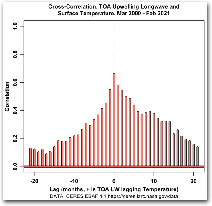 It’s worth noting in this context that because we are dealing with radiation in the atmosphere, things happen at the speed of light. A cross-correlation analysis shows that there is no delay between monthly changes in surface temperature and monthly changes in TOA longwave.