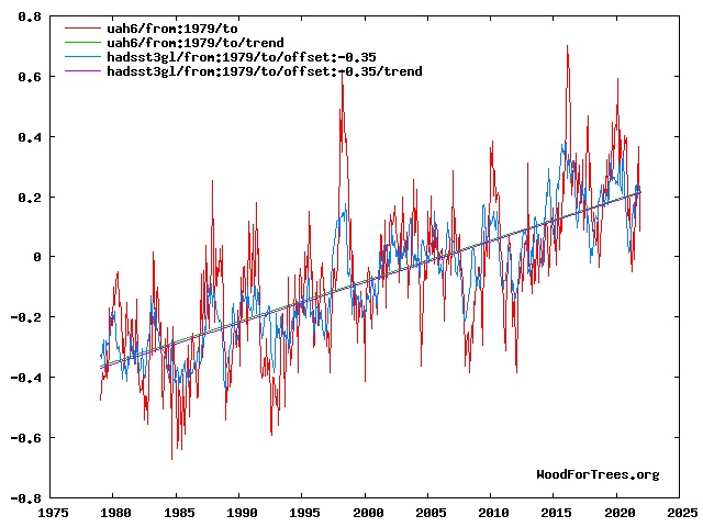 https://woodfortrees.org/plot/uah6/from:1979/to/plot/uah6/from:1979/to/trend/plot/hadsst3gl/from:1979/to/offset:-0.35/plot/hadsst3gl/from:1979/to/offset:-0.35/trend
