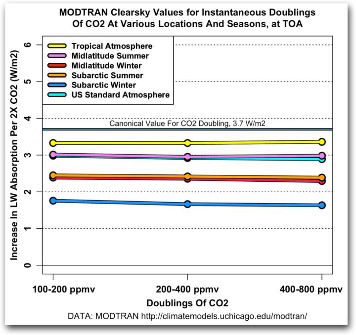 In my last post, entitled Advection, I was discussing the online MODTRAN Infrared Light In The Atmosphere model. A commenter pointed out that in the past I’d wondered about why the MODTRAN results showed that a doubling of CO2 caused a clear-sky top-of-atmosphere (TOA) decrease in upwelling longwave (LW) radiation of less than the canonical value of 3.7 watts per square meter (W/m2) per doubling of CO2. Here’s that data.