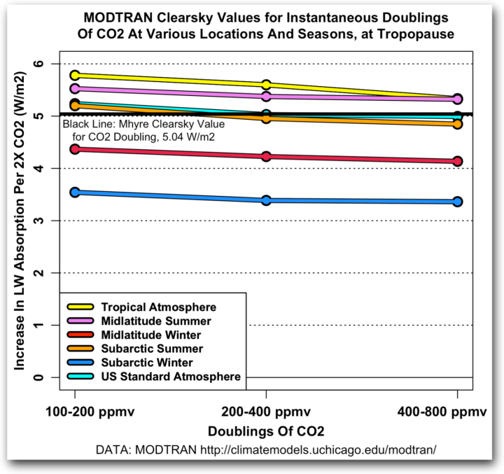 What Myhre did was to add a “hot fix” for this issue. The 3.7W/m2 figure is the growth of the CO2 effect including overlaps, which is irrelevant. So he introduced an “innovation” by taking CO2 forcing top of the troposphere instead (which is a bit larger) and arbitrarily adding “back radiation” from the stratosphere to it. In this way he can allow for overlaps and still maintain the 3.7W/m2 envelope.