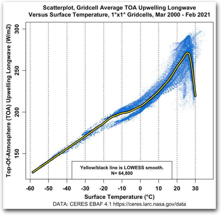 But at temperatures above about 26°C, the situation changes rapidly. Above that temperature, the upwelling TOA longwave drops very rapidly with increasing temperature.
