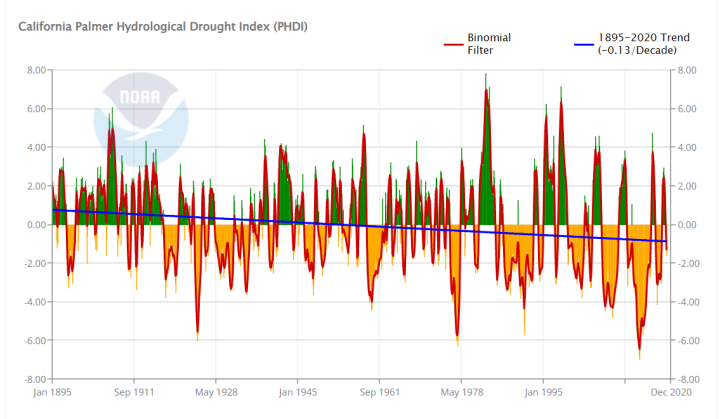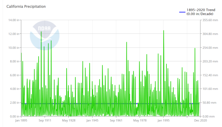 As stated in the report, “The current drought is not part of a long-term change in California precipitation, which exhibits no appreciable trend since 1895.” The data can easily be accessed here: NOAA/Climate at a Glance.