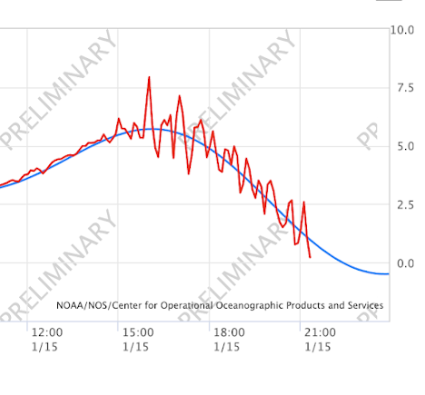 The water wave moves slower, around 400 mph (and occasionally approaching 500 mph)….so a later arrival was expected. Thus, at Neah Bay, at the entrance to the Strait of Juan de Fuca, the water wave arrived around 9 AM (17:00 UTC as shown on the chart), as indicated by the waviness in the water level after that time. The amplitude of the variation is around 2 feet.