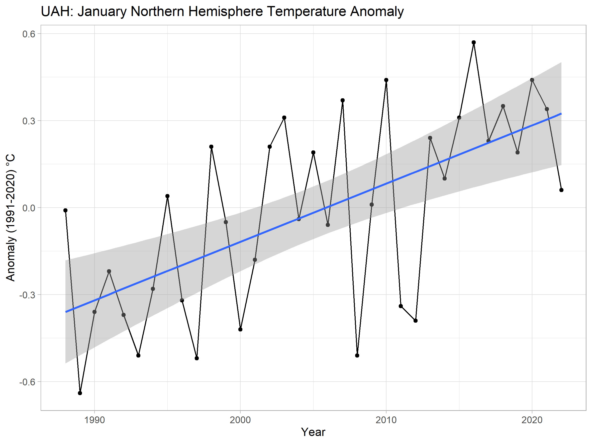 You nailed it! The error bars get wider and wider if the timespan for the trend is reduced more and more. And the internal flucuations get more influence when the span shortens. Therefore the slope of the trend from 1988 to 2022 tells nothing at all about the forced trend. It’s only a cherrypicked startpoint in the noise, mostly introduced by the NAO which is the leading internal variability in mideurope in the winter season. The post is maningless, not my response.