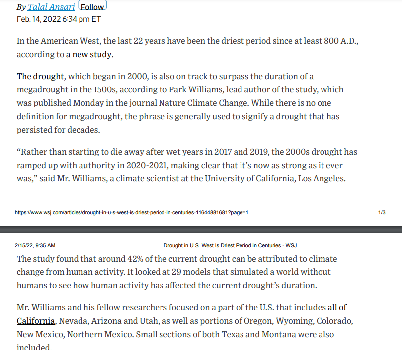 Quote from the report itself: “… throughout the 2000s drought anomalies have accumulated as fast or faster than the most intense 22-yr, drought anomalies … without ACC [anthropogenic climate change] 2000-2021 would not even be classified as a single extended drought event….”