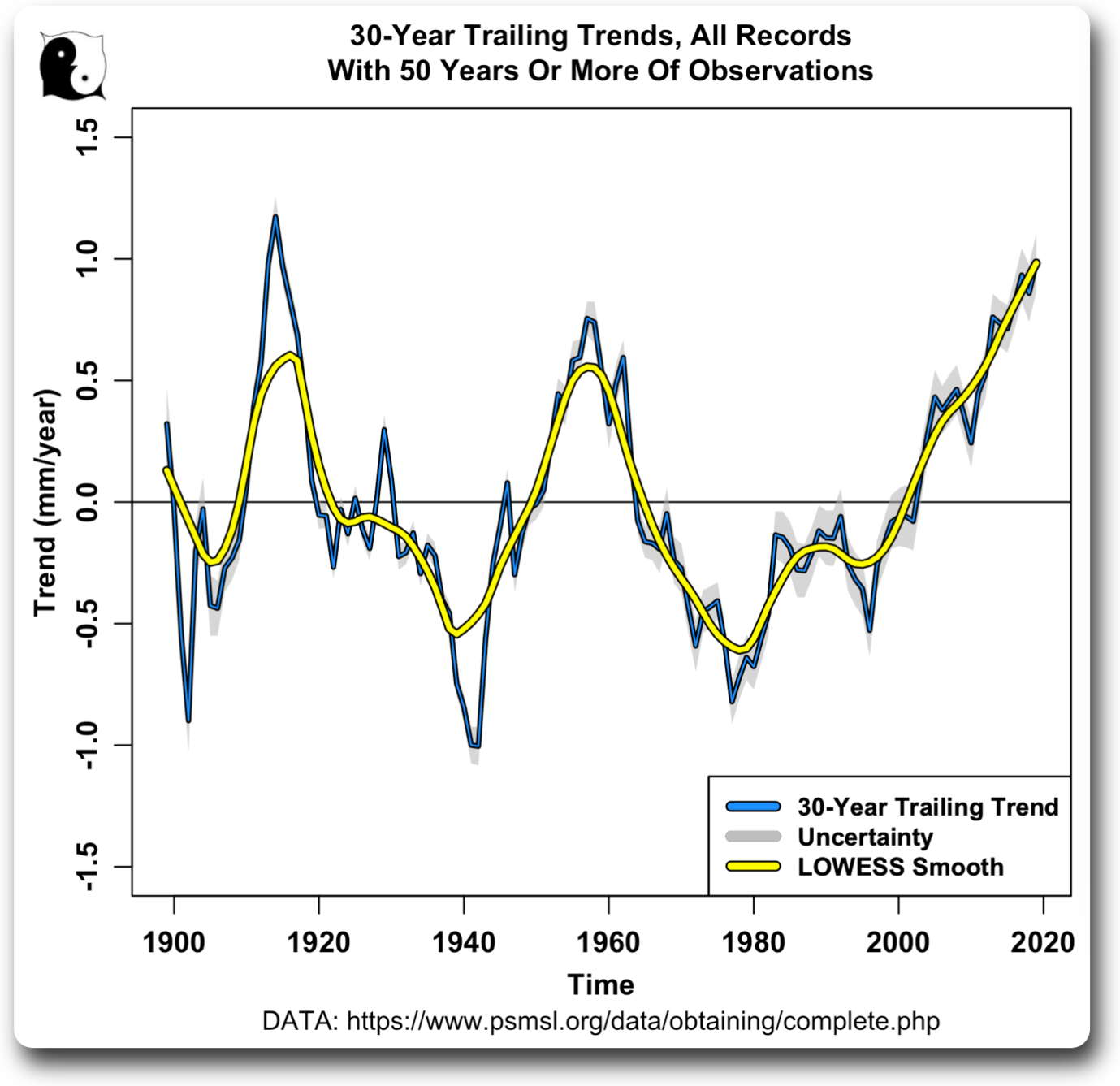 As you can see, the trends have gone up and down, but there’s no apparent overall increase. The largest rate of rise was around 1915.