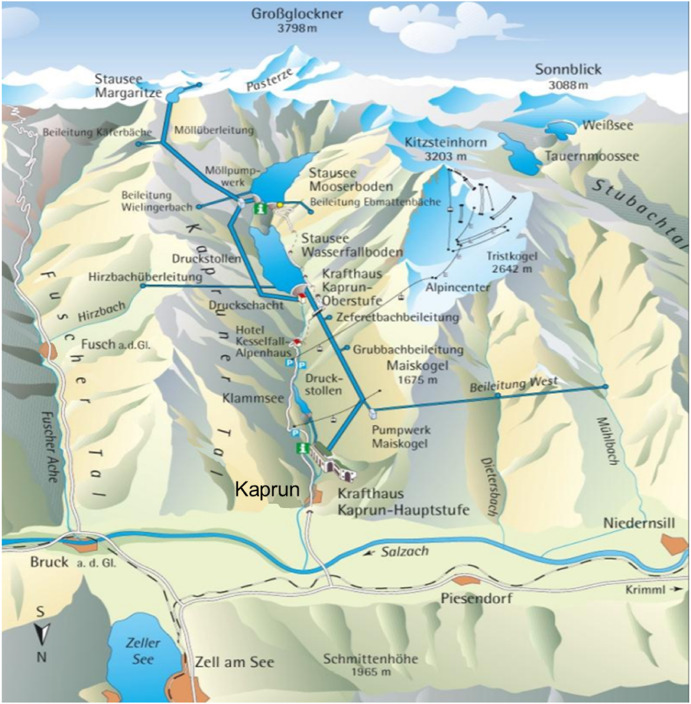 Fig. 1. Conventional hydropower in steep mountains. Kaprun hydropower and pumped storage plant in Austria. The plant consists of high dams and tunnels to increase the catchment area of the plant and to connect to the Salzach River and the lower reservoir Zeller See.