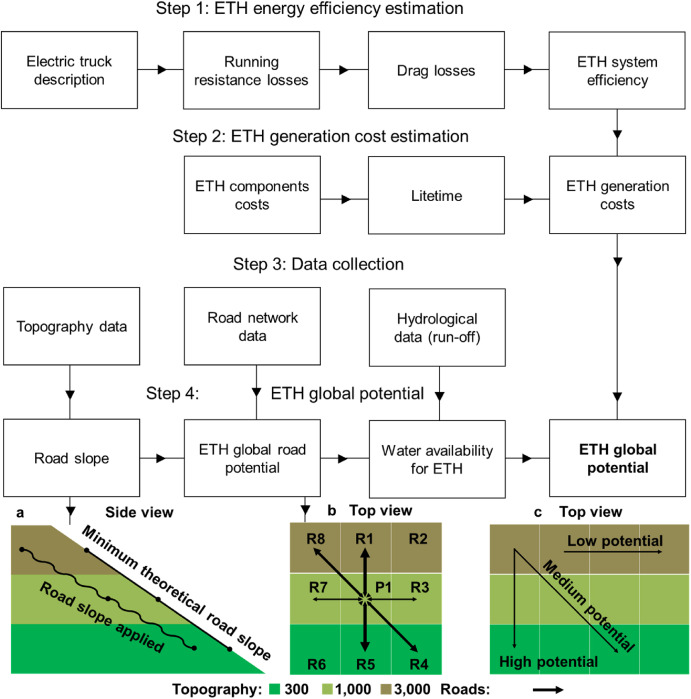 Step 4: ETH global potential. There are three main limitations to the potential for ETH. The first and most important is the change in topography, which is described in Fig. 3 and is used to estimate the road slope. By combining the road slope with the existing road infrastructure, one can estimate the ETH global road potential. Then the water availability for ETH can restrict the road potential and the existing amount of water available for hydropower. The equation applied to estimate the ETH global potential is described in Eq. (5). The potential for ETH is estimated in a resolution of 5 arc minutes (∼8 × 8km). To better present the results the ETH potential in a 1-degree resolution is summed.