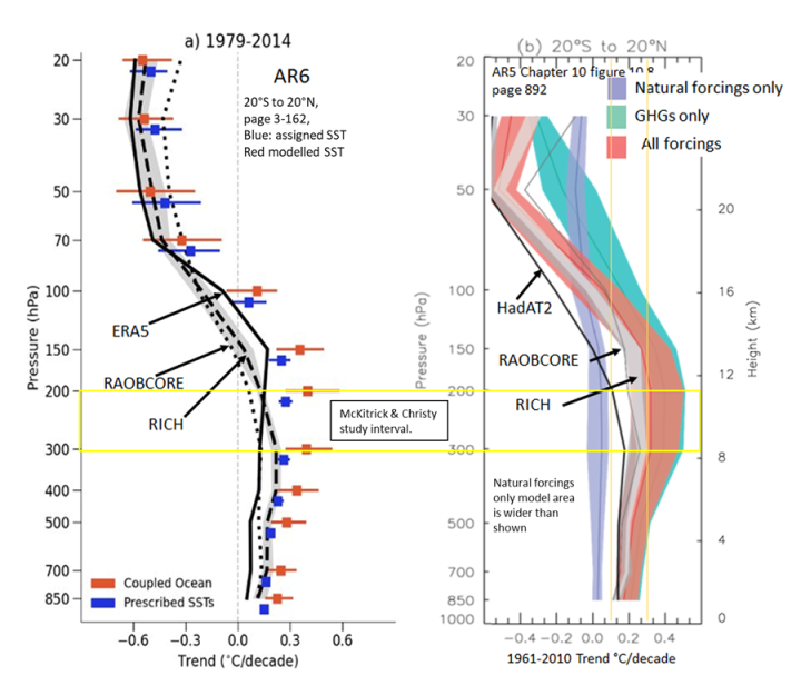 The IPCC AR5 report was published in 2013 and the CMIP5 climate models they used, have been shown to predict faster warming than observed in the tropical troposphere at a statistically significant level by Ross McKitrick and John Christy.[1] This problem is acknowledged and discussed in the latest AR6 report, published in 2021, but brushed aside as unimportant. In AR6, the IPCC observed: