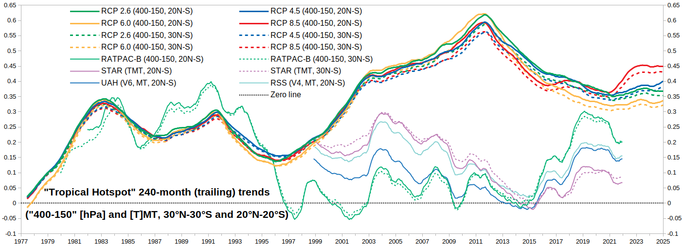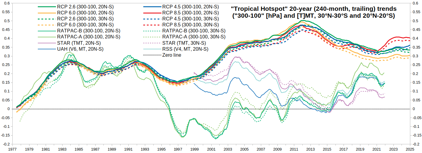 Assuming the “tropical hotspot” goes from 30°N to 30°S latitudes and from 100 hPa to 450 hPa “altitudes”, extracting area-weighted averages from the gridded arrays (with “month, altitude, latitude band” coordinates) of STAR, RATPAC-B and CMIP5 “taz” (from Climate Explorer, the equivalent for CMIP6 is not yet available) data, I generated the graph below of 20-year (240-month, trailing) trends.