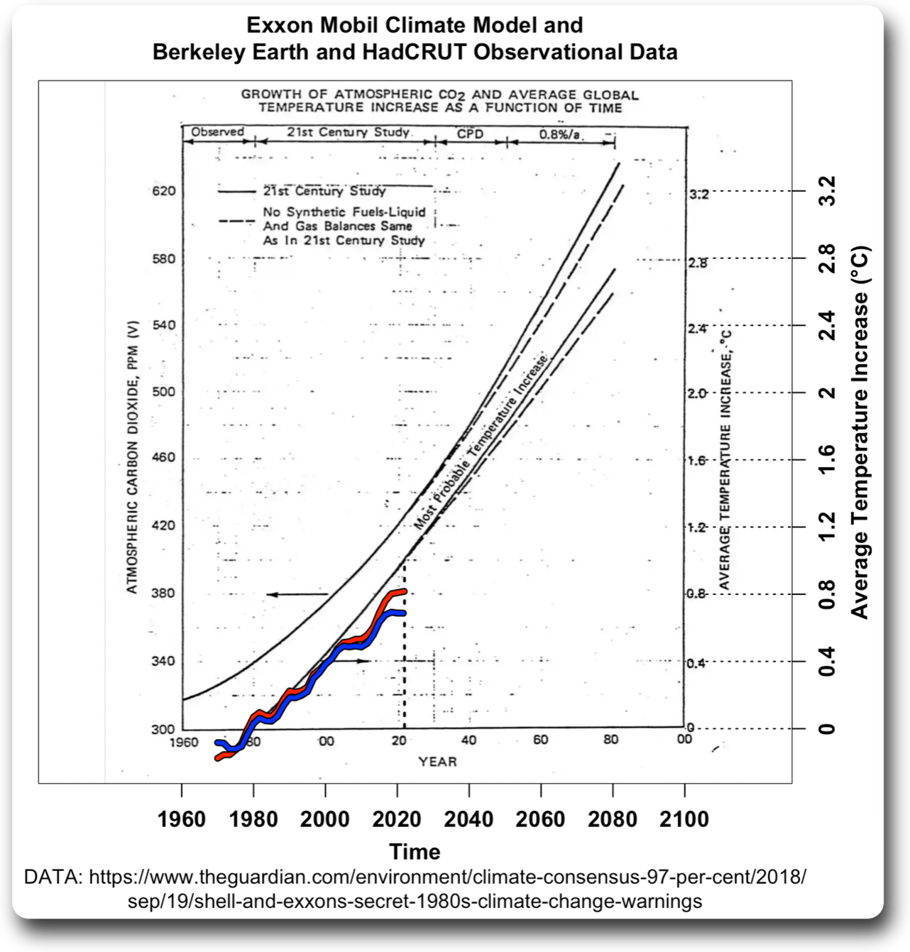 Figure 3. Global surface temperature observations from Berkeley Earth (red) and HadCRUT (blue), along with the average of the 222 climate models.