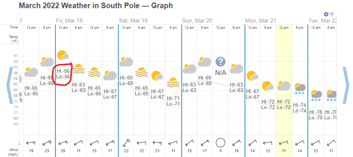 “The average temperature at the Amundsen–Scott South Pole Station between April and September, a frigid minus-78 degrees (minus-61 Celsius), was the coldest on record, dating back to 1957” (Washington Post October 2021).