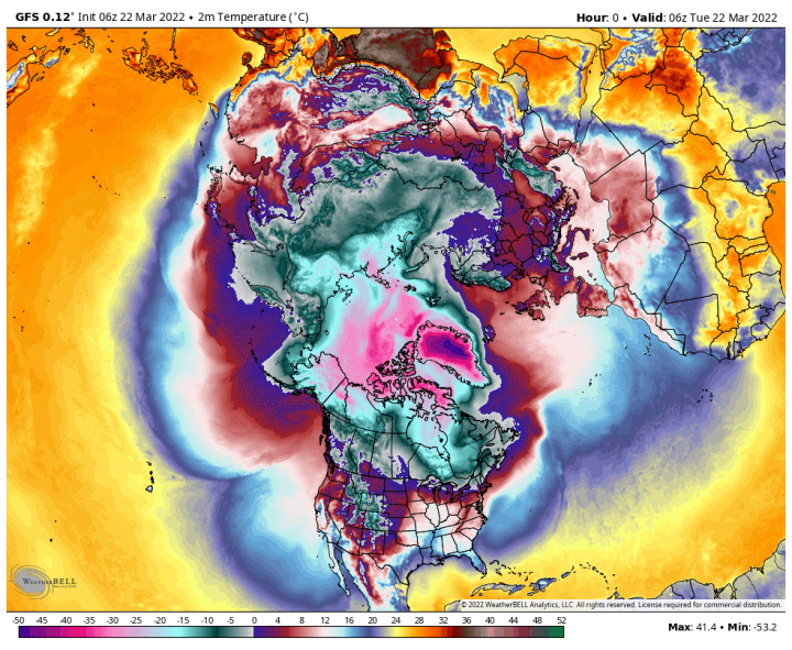 If we look at that same “model simulation” just four days later, from the same source, all of the sudden that “flabbergasting” image is gone, and temperatures are frigid again as seen in Figure 2 below.