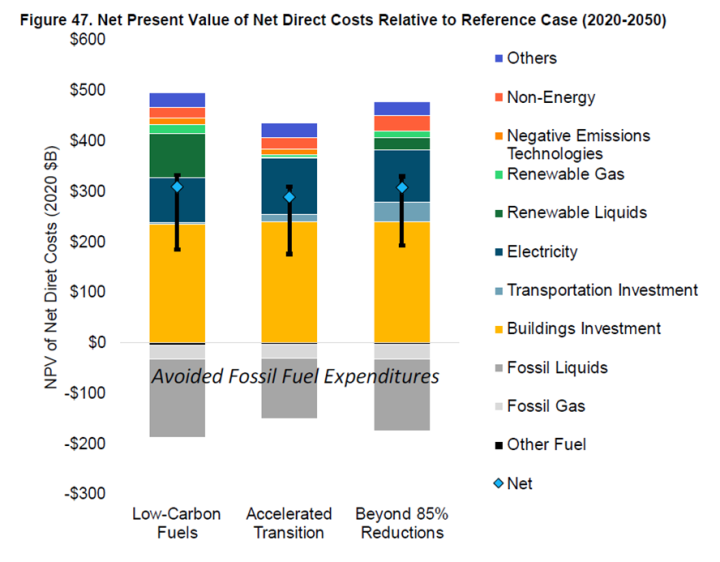 Appendix G Figure 47 lists the NPV of net direct costs relative to the reference case. This illustrates what is meant by the net direct costs label. In each of the mitigation scenarios there are avoided fossil fuel expenditures that are subtracted from the total costs of the implementation strategies to get the ~$300 billion net direct costs.