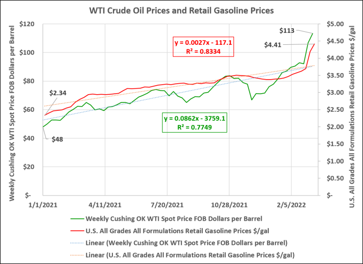 Since the beginning of 2021, crude oil prices have actually risen significantly faster than retail gasoline prices.
