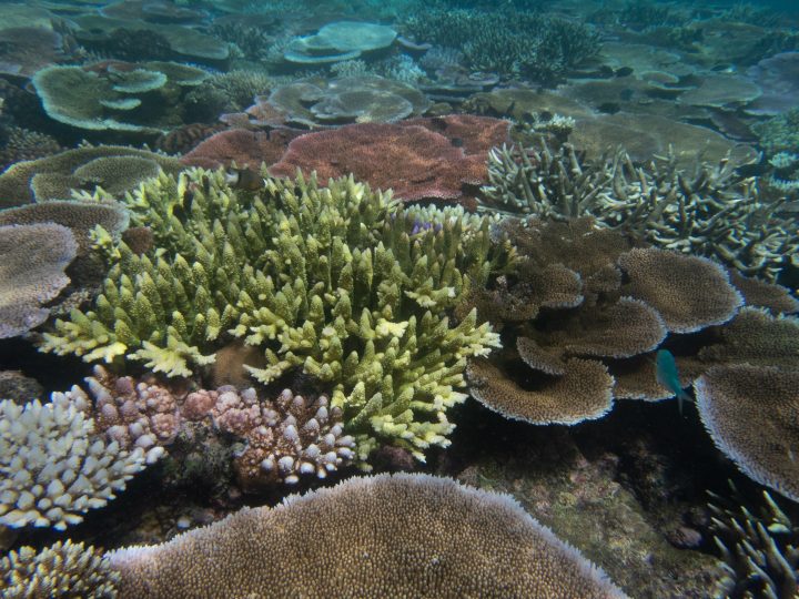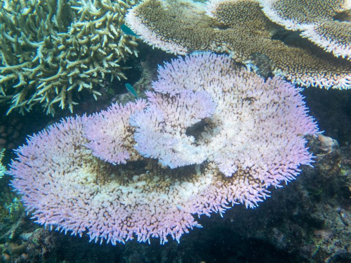 While most of the corals at the reef crest were healthy, there were some corals that were bleaching white and others were bleaching colourful.