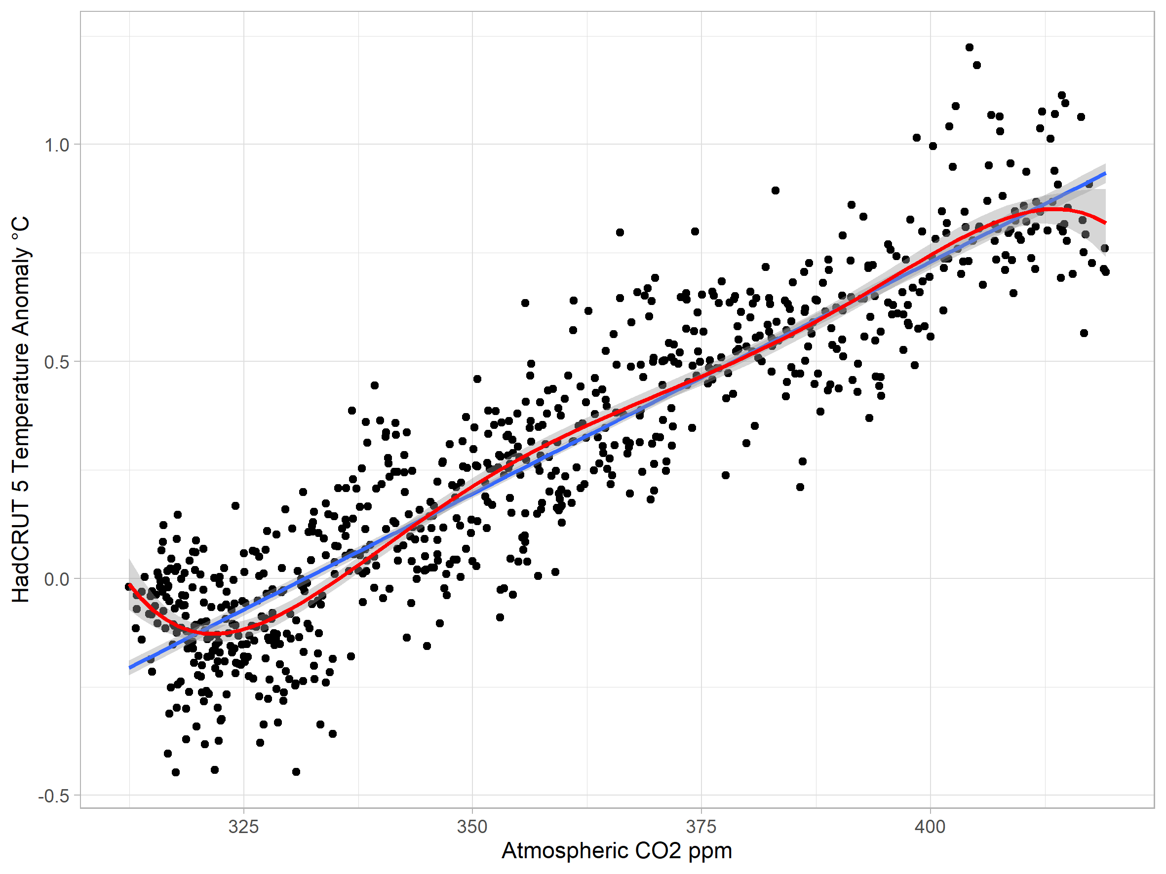 Show mathematical relationship between CO2 and temperature and you’ll have a lot of adherents, even from here. Simple regressions of two time series won’t suffice. The x-axis needs to be CO2 ppm and the y-axis needs to be temperature with an equation showing the relationship.