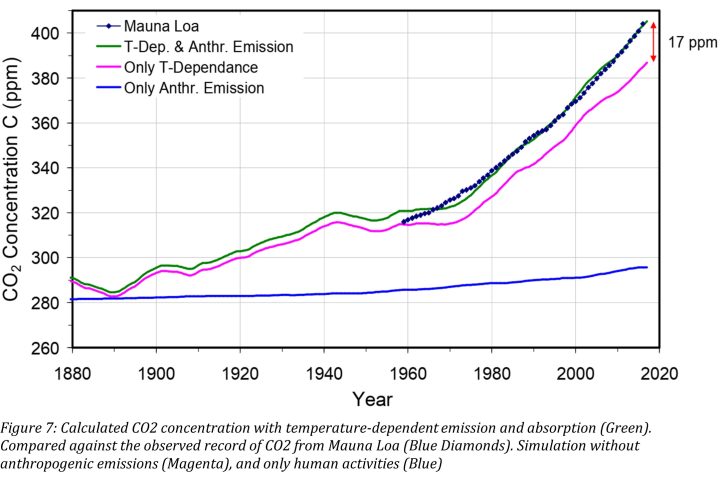It turns out that this simple model does an excellent job in describing the increased concentration in the atmosphere and also provides logical explanations for all the other observations made so far. In the following chart (Figure 7), the blue line shows the concentration increase due to anthropogenic emissions (human CO₂) and the purple line the concentration increase due to emissions due to increased temperature. The green line is the sum of the two. The green line corresponds well with the measurements in Mauna Loa (blue blocks).