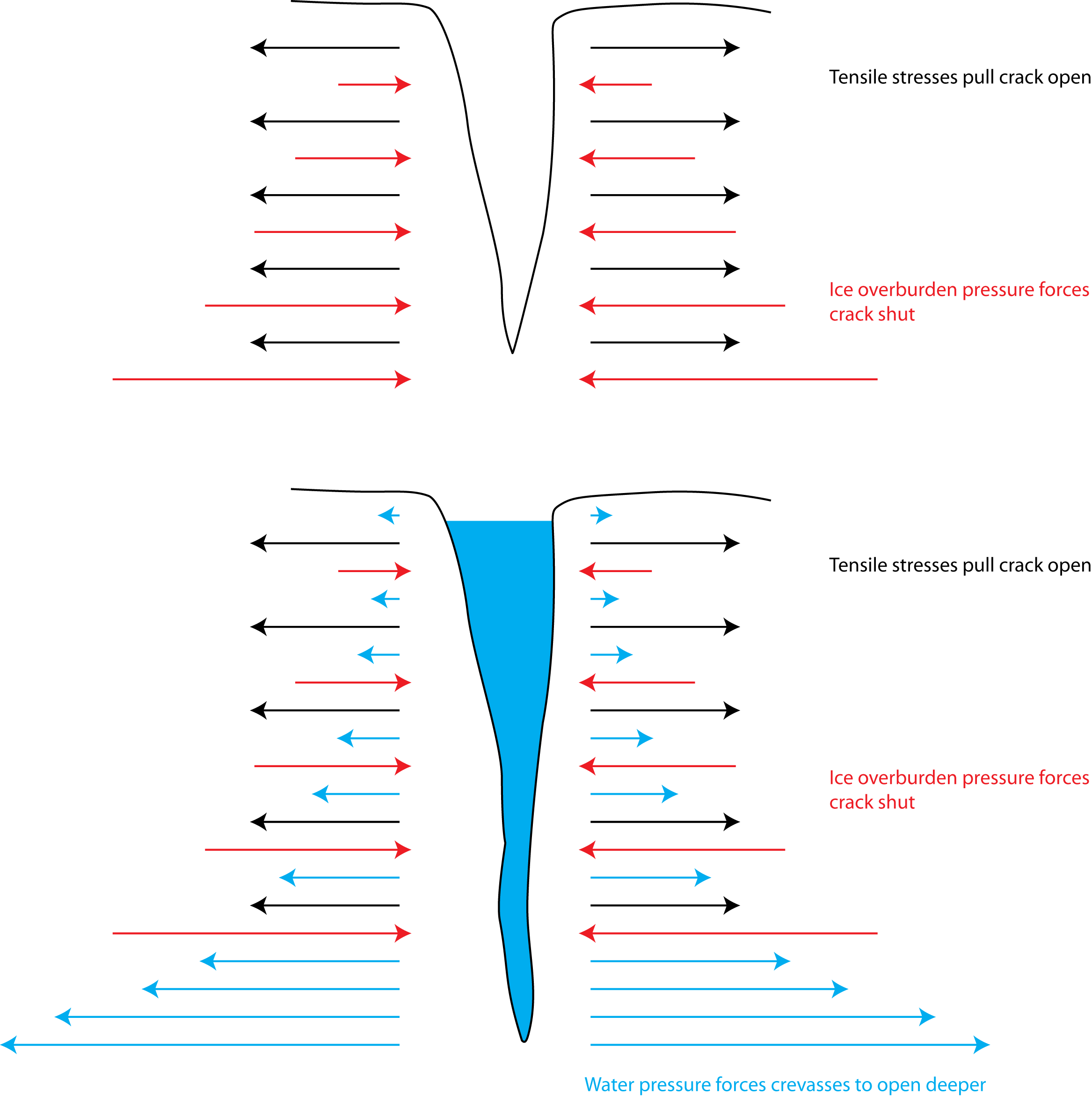 I cannot see how a pool of water like that illustrated can contain enough spare energy to melt its way down to the base and then lubricate the underside. Surely it is lost by freezing before the meltwater passes all the way through ice at below freezing. Geoff S