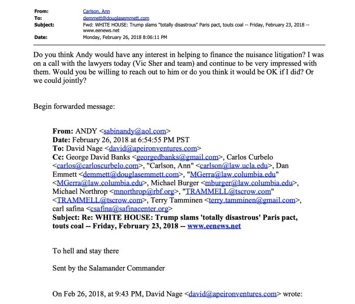 So, Terry [Tamminen]’s group — at the time Tamminen was CEO of the Leonardo DiCaprio Foundation — and Dan Emmett are “strong supporters” of the Sher Edling litigation. And their colleague om several environmentalist enterprises, major Republican ‘green’ donor Andy Sabin was targeted to possibly help fund the assault, too.