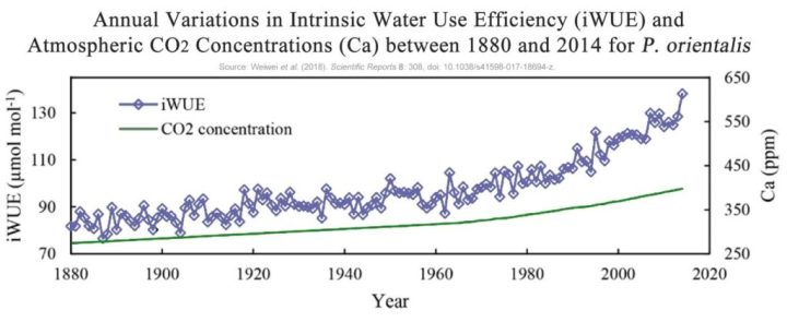 Evidence of this fact is frequently noted in scientific studies utilizing dendrochronological methods and stable isotope analyses on long-lived tree species from all across the globe. Figure 2, for example, depicts the change in atmospheric CO2 and water use efficiency for an evergreen coniferous species in China. Since 1880, the rise in atmospheric CO2 has helped boost the water use efficiency of these trees by an incredible 60%.