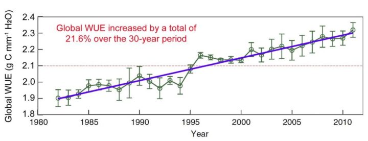 Results of their work, as shown in Figure 3, reveal that global water use efficiency increased at a mean rate of 13.7 milligrams of carbon per millimeter of water per year, experiencing a phenomenal 21.6% enhancement over this three-decade-long period, almost all of which was attributed to rising atmospheric CO2.