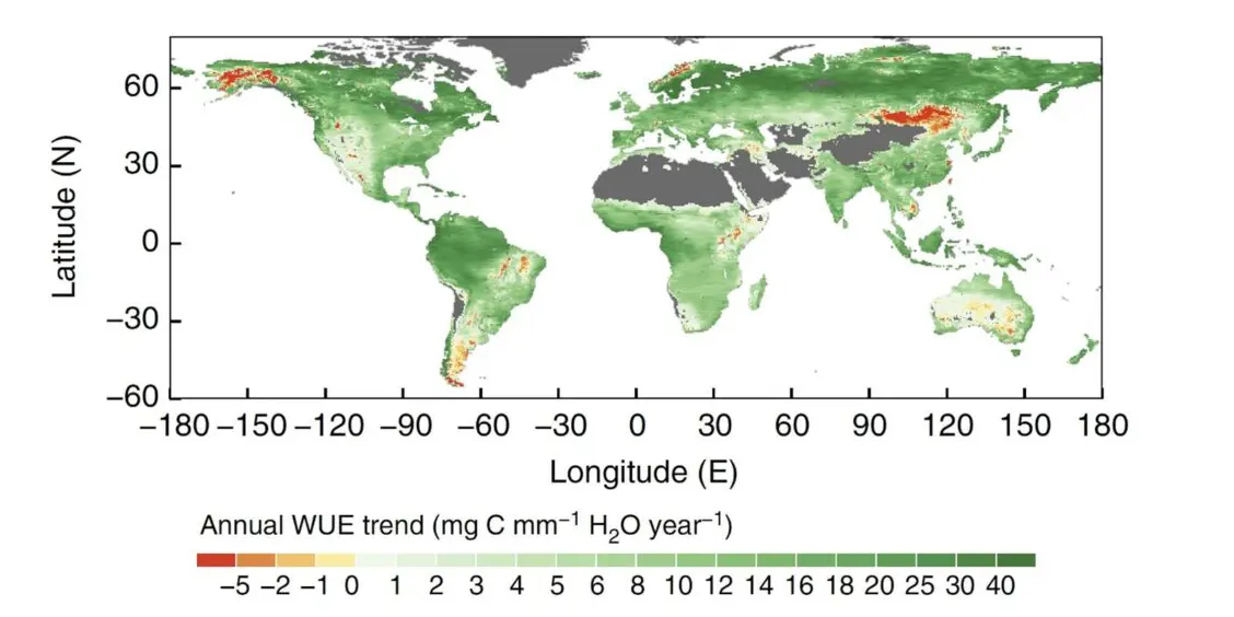 Figure 4. Estimated spatial trends in annual water use efficiency over 1982-2011. Source: Cheng et al. (2017).