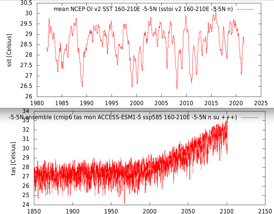 All climate models have this wrong. Actual measured compared with absurd modelled temperature for Nino4 region of the Pacific attached.