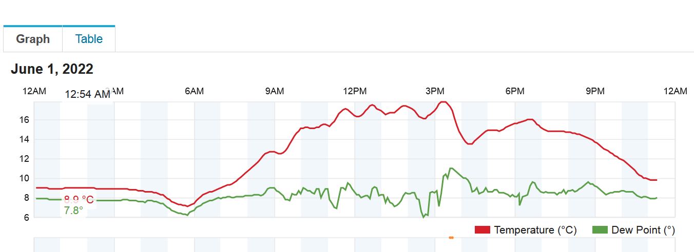 (in this case sunrise was at 04:30, soil temp was 15°C, having started May at 14°C)