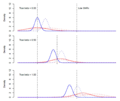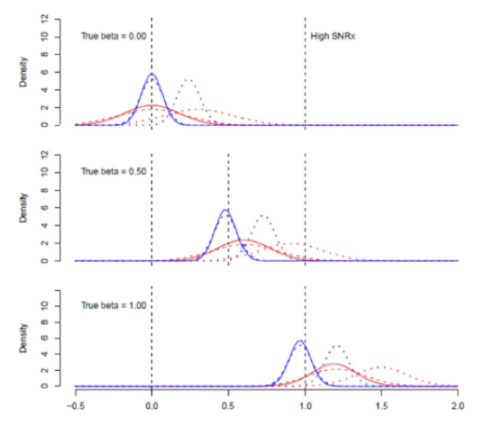 For the next batch of estimates I reduced the variance of the noise on the X’s, which I call the high SNRx case.