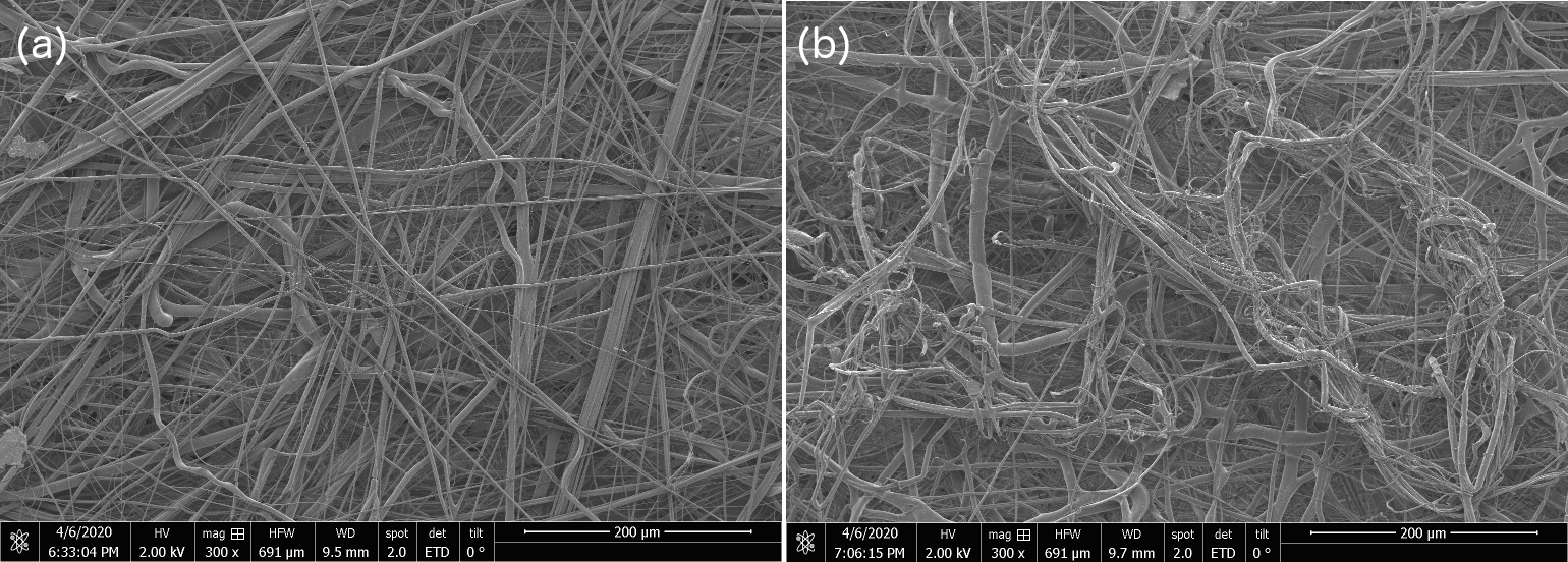 And how thick is a spun woven polypropylene mask compared to the average space between the fibers?