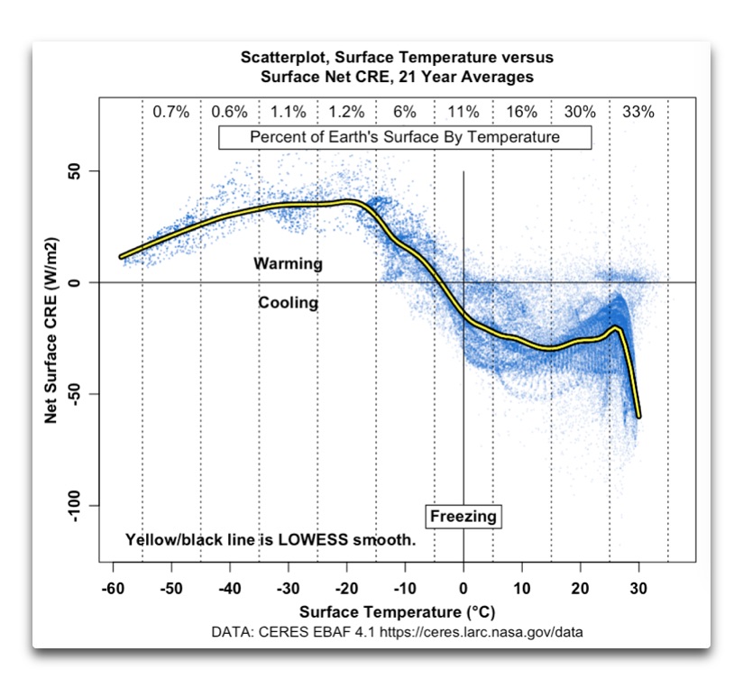 It turns out the CRE gross is larger than the albedo effect of clouds. The claim of clouds cooling is unsubstantiated. And indeed we see clouds are actually warming if we analyze weather records.