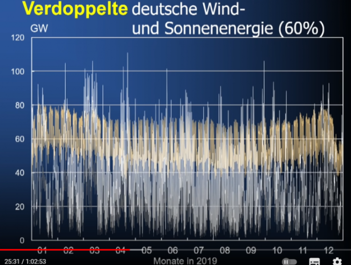 Prof. Sinn explains that another major problem is: “Electricity from wind and sun is too volatile to assure an affordable and complete power supply. Even if Germany doubles it’s current wind and solar production capacity, doing so will only double the volatility of the supply: