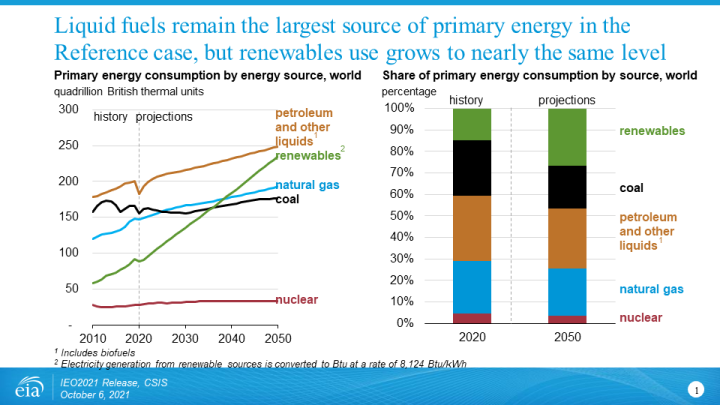 According to the EIA’s 2021 International Energy Outlook, fossil fuels will still account for about 70% of global primary energy consumption in 2050.