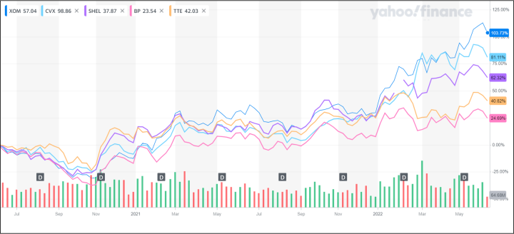 European Major “Oil” Companies: Shell (SHEL, purple), BP (BP, gold), TotalEnergies (TTE, magenta)