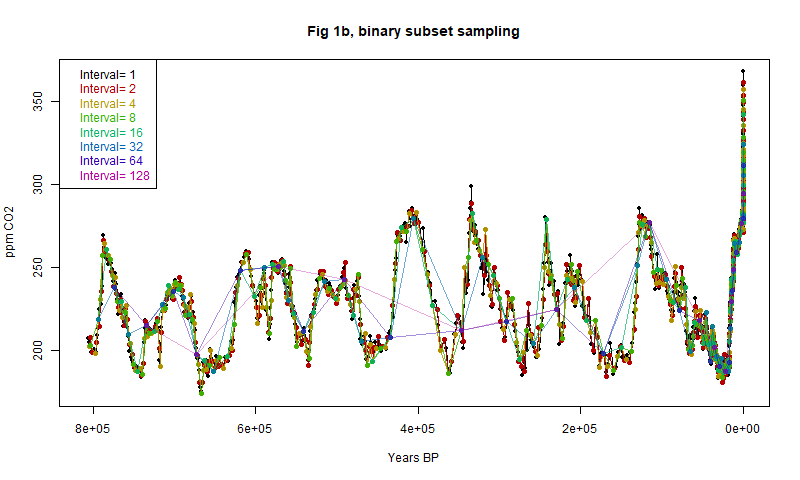 Figure 1a shows the IPCC’s figure of CO2 fluctuations over the past 800,000 years. This appears as a continuous and evenly sampled line, but it is not. Ice cores are sampled for CO2 at discrete locations along the core. Figure 1b plots the individual CO2 data points showing obvious gaps of up to hundreds of years between samples.