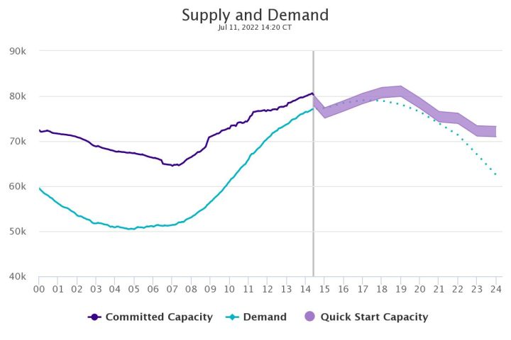 ● Low wind. While solar power is generally reaching near full generation capacity, wind generation is currently generating significantly less than what it historically generated in this time period. Current projections show wind generation coming in less than 10 percent of its capacity.