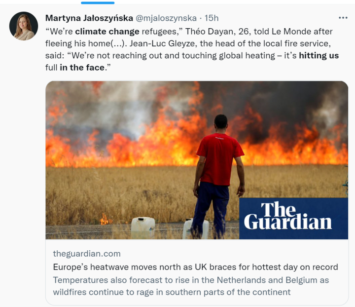 The Guardian and BBC are full of apocalyptic predictions about how this is the future and its going to get worse and hotter and hotter. No reason to think so. Its just a heat wave. There have been such things before and there will be again. Just as there have been extreme late snowfalls and extreme cold periods in winter.