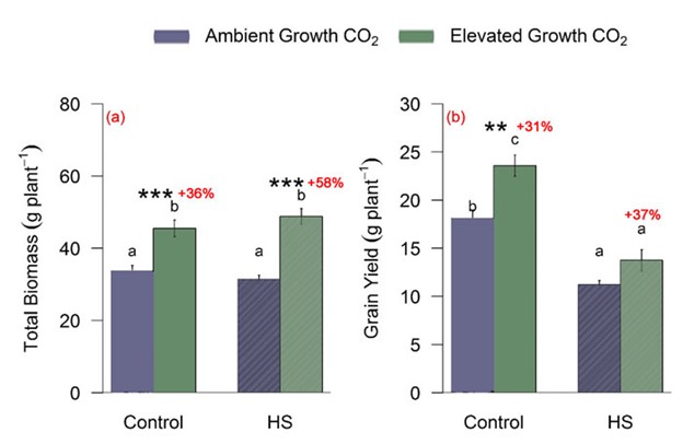 Figure 3. Total biomass (a) and grain yield (b) of wheat plants at harvest in response to elevated CO2 and heat stress (HS). Values represent means ± SE using two-way ANOVA. Means sharing the same letter in the individual panels are not significantly different according to Tukey’s HSD test at the 5% level. Statistical significance levels (t-test) for eCO2 effect are shown as follows: ** P < 0.01: *** P < 0.001. The percentages in red text indicate the change in biomass or grain yield due to elevated CO2 under control or heat stress conditions. Source: Chavan et al. (2019).