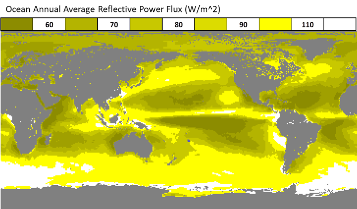 It is noticeable that the Southern Ocean is also highly reflective. This aligns with the surface temperature in the range -1.8C to 15C where convective instability cannot occur and some of the 15C to 22C where convective instability is not cyclic. The Southern Ocean and small regions in the North Pacific and North Atlantic have bright condensing/solidifying cloud due to air in circulation from low latitudes being cooled at higher latitudes.