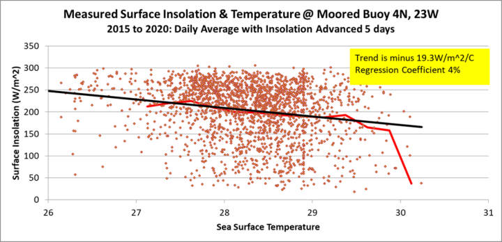 From observation at tropical moored buoys, the heat engine requires surface insolation averaging 200W/m^2 to keep the engine fully stoked. The drop in surface insolation with temperature is observed to be 20W/m^2/C. Pacific moored buoy 8N, 137E exhibited a trend of -21/2W/m^2/C for the six year period 2015 to 2020.