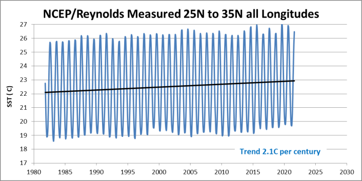 Besides having the trend wrong, it also forecasts the physically impossible of the open ocean surface temperature sustaining 30C for months on this chart and permanently by 2100 in the model output. Climate models bear no relationship to reliable measured data.