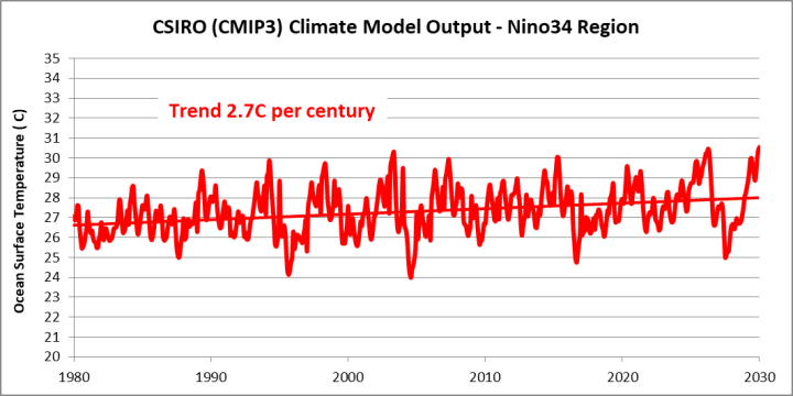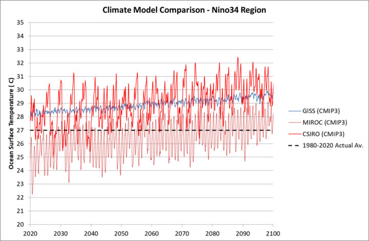 The performance of all climate models in the Nino34 region is poor. They all show warming trends in the region between 1980 and 2020 so do not even get the trend in the right direction. The following chart shows the output of the CSIRO Climate Model using the CMIP3 input data of early 2000s vintage.